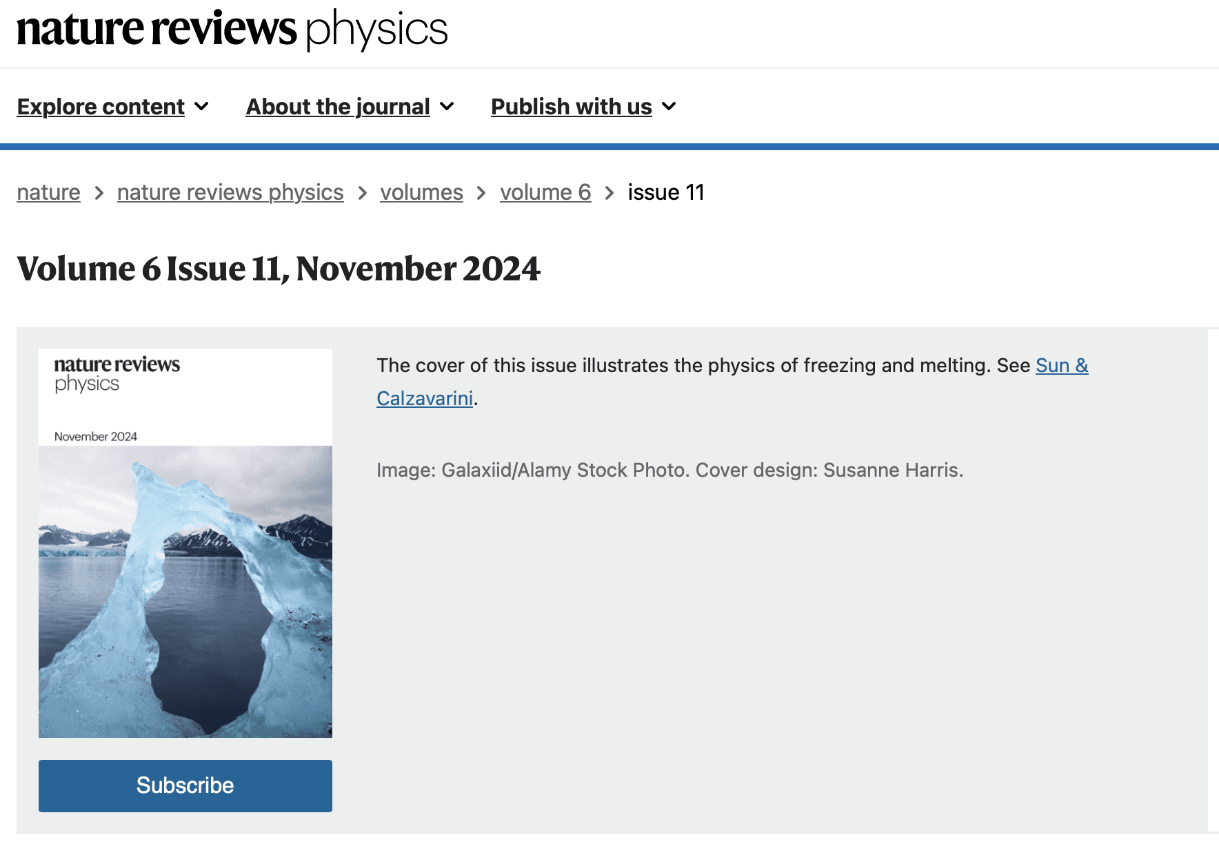 2024.11.08 课题组揭示水体流动和冰水相变的耦合动力学综述被选为 Nat. Rev. Phys. 封面论文